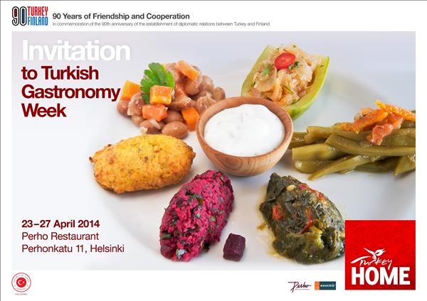 Türkiye Cumhuriyeti ile Finlandiya Cumhuriyeti arasındaki diplomatik ilişkilerin 90. yıldönümü vesilesiyle, 23-26 Nisan 2014 tarihleri arasında Perho Culinary School restoranında Türk Yemekleri Haftası düzenlenecektir.