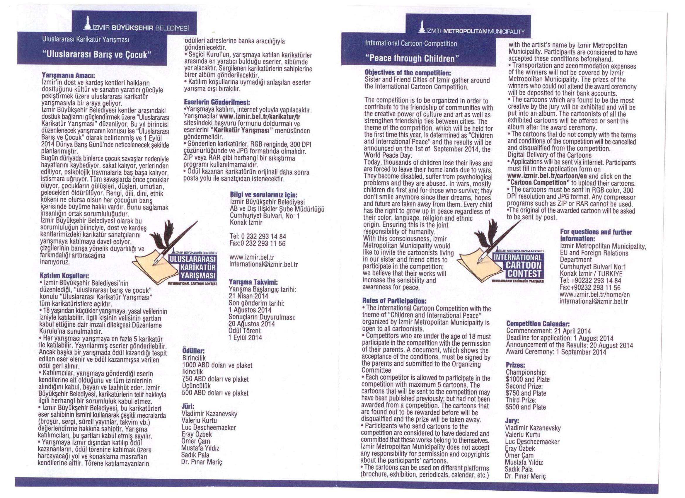 Yazıda, bahsekonu yarışmanın temasının anılan Belediyenin mevcut ilişkilerinin kentler arasındaki dostluk bağlarını güçlendirecek toplumları yakınlaştırmayı hedefleyen yönü de göz önünde bulundurularak "Barış ve Çocuk" olarak belirlendiği, Belediyenin kardeşkentlerindeki karikatür sanatçıları başta olmak üzere dünyanın birçok kentindeki sanatçıların yarışmaya katılımının sağlanmasının öngörüldüğü ve yarışmanın 1 Eylül Dünya Barış Günü sonuçlanacak şekilde planlandığı belirtilmektedir.