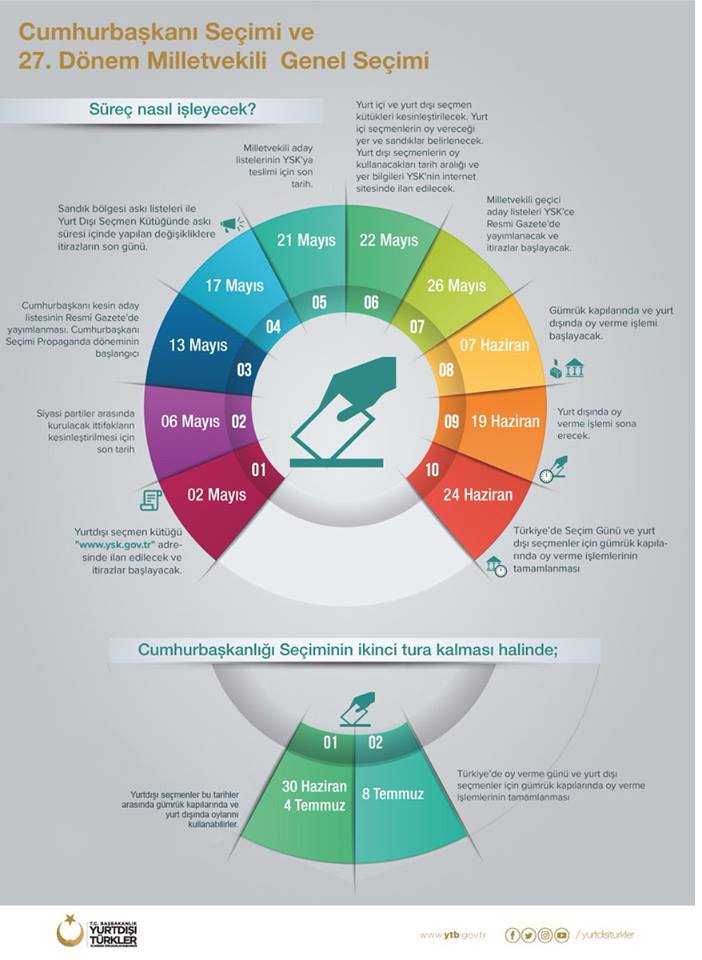 -Cumhurbaşkanı seçiminin ikinci tura kalması halinde, dış temsilciliklerimizde 30 Haziran-4 Temmuz 2018, gümrük kapılarında 30 Haziran-8 Temmuz 2018 olarak belirlenmiştir.